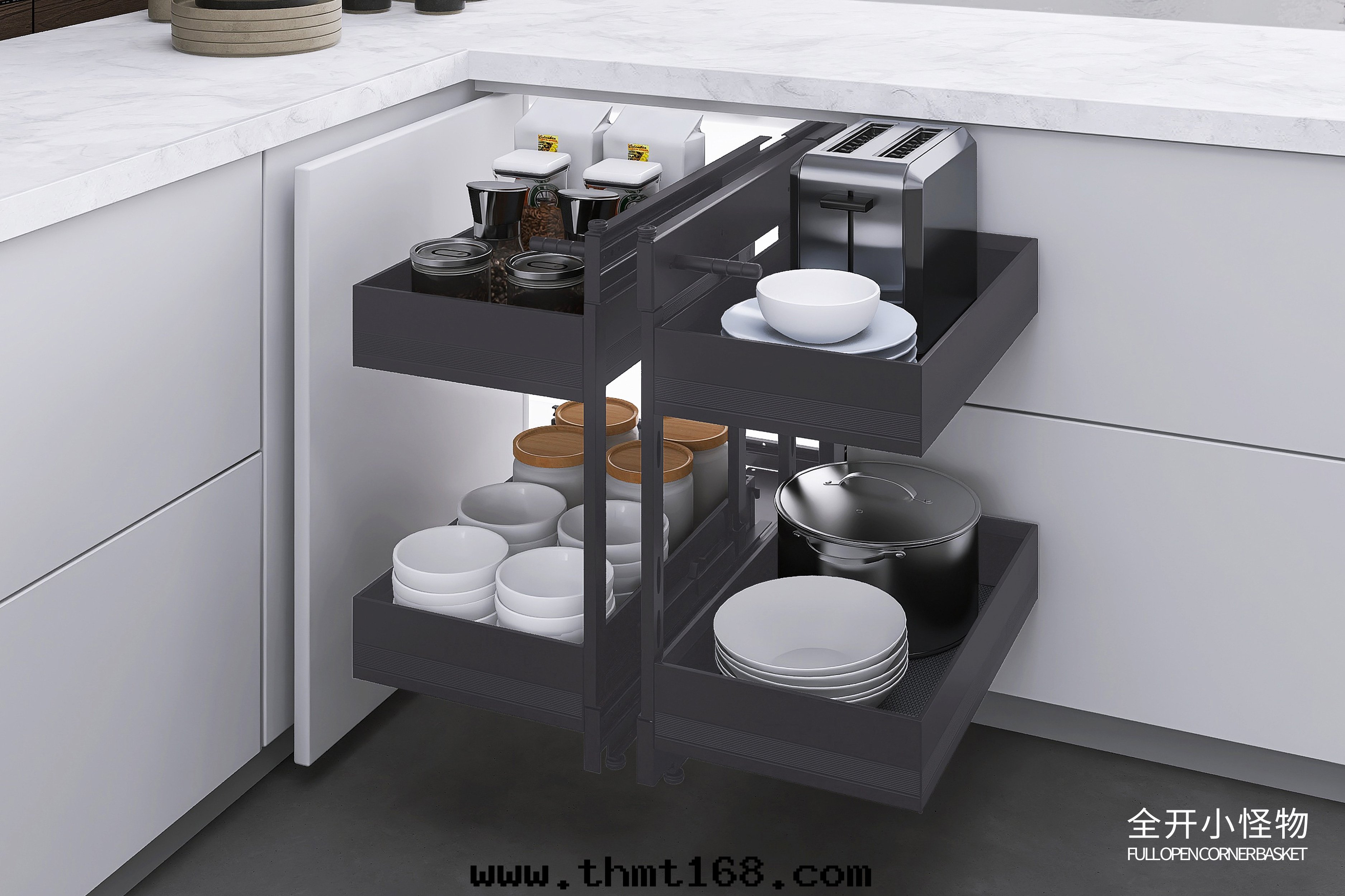 拉籃是(shì)橱櫃中(zhōng)的(de)收(shōu)納小能(néng)手(shǒu),能(néng)夠最(zuì)大(dà)限度(dù)的(de)使用(yòng)内置空(kōng)间,将拐角(jiǎo)處(chù)的(de)废棄空(kōng)间充分(fēn)利用(yòng),讓廚房(fáng)收(shōu)納不(bù)再是(shì)问題(tí)。